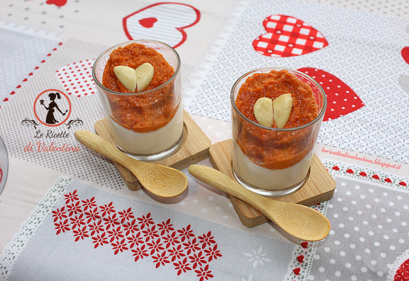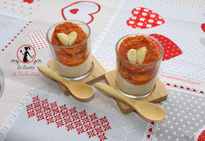 Con un cucchiaino o una spatolina piccola stendete uno strato uniforme sulla superficie delle pannacotte e decoratele con il cuoricino di mandorla, rimettete in frigorifero a riposare altri 30 minuti prima di servire.