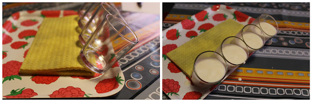 La foto è più esplicativa di mille descrizioni. Riempite i bicchieri fino quasi all’orlo del bordo inclinato e lasciate raffreddare a temperatura ambiente, poi trasferite in frigorifero per 2 ore minimo.