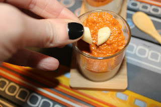 Ho voluto rendere anche bello da vedere questo antipasto creando un gioco di equilibrio visivo. Detto così sembra una cosa complicatissima, in realtà basta trovare il modo di tenere i bicchierini dove andrete a servire l’antipasto, in maniera stabile obliqua. Io ho utilizzato un vassoio con bordo rialzato e una spugna.