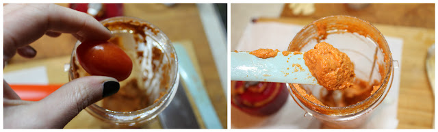 Intanto preparate il pesto di pomodorini. Sgocciolate grossolanamente i pomodori sott’olio ed inseriteli nel bicchiere del robot da cucina, andrà bene anche un minipimer. Unite l’acciuga, il pepe, la paprica, i 2 pomodorini freschi, l’olio e 8 mandorle, frullate fino ad ottenere una crema densa e liscia.
