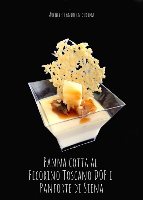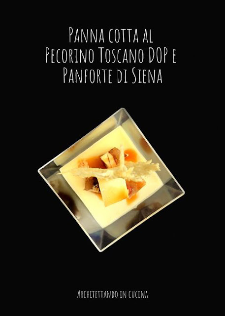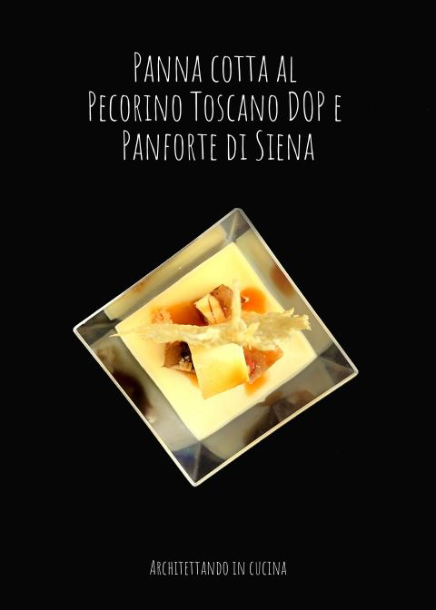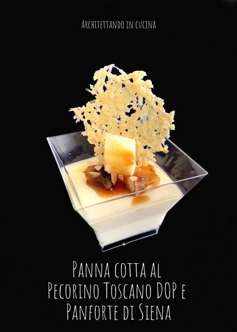 Decorare il bicchierino di panna cotta con 2 dadini di Panforte, 1 dadino di Pecorino Toscano DOP, alcune gocce di Elisir d’uva Zibibbo “La Nicchia”e pezzetti di cialda di Pecorino.