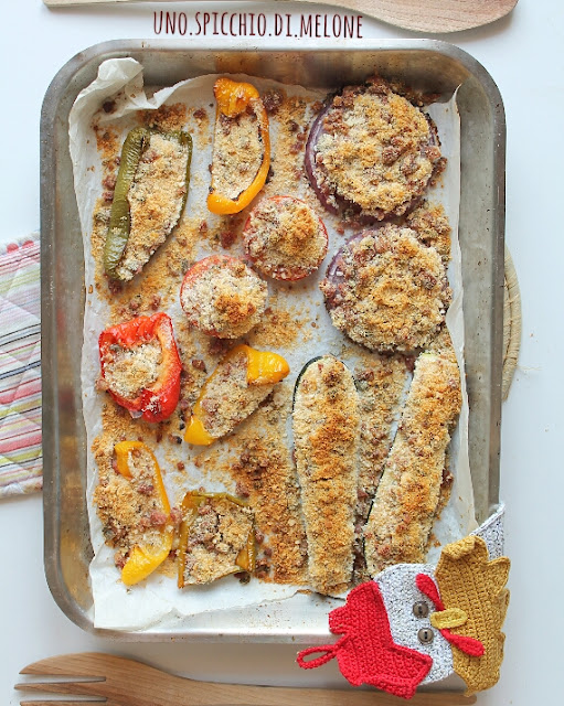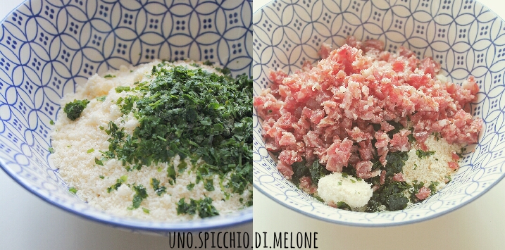 Per ogni verdura tagliata calcolate 1 cucchiaio da cucina di pangrattato, mezzo cucchiaio da cucina di formaggio grattugiato, mezzo cucchiaio da cucina di prezzemolo e mezza fetta di salame.