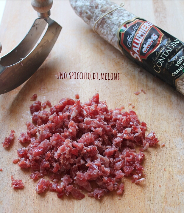 Affettate il salame e tritate, con l’aiuto di una mezza luna, le fette.
