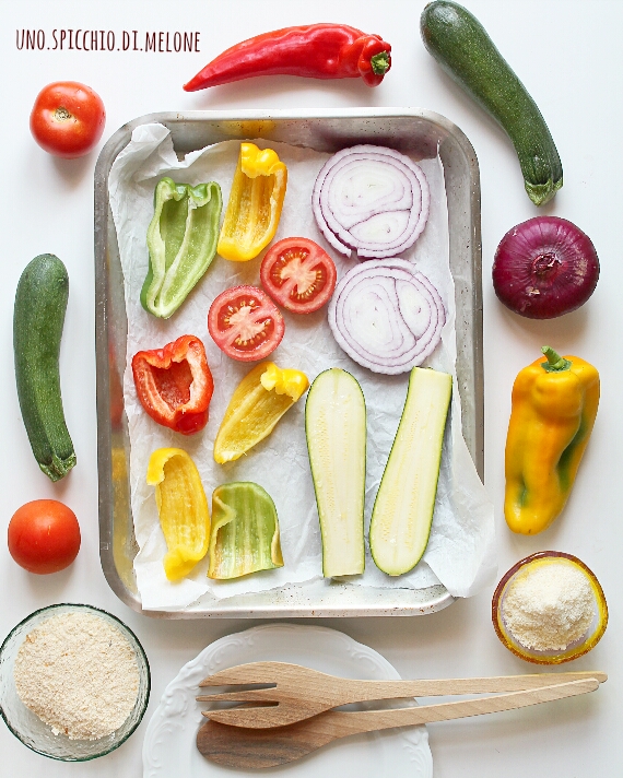 verdure ideali da essere gratinate (zucchine, peperoni, cipolla, pomodori, ecc.)