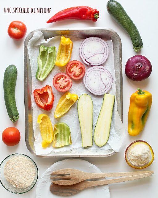 Innanzitutto lavate le verdure, le tagliate (consiglio pezzi non troppo grossi per facilitare la cottura) e le disponete su una teglia da forno (ricoperta da carta da forno).