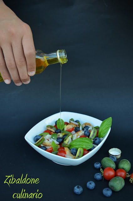 Aggiungere i mirtilli lavati, i pomodori a rondelle, i Nergi a spicchi, cipollotti affettati sottilmente e foglie di basilico.
