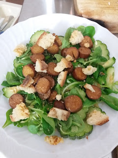 Adesso resta una sola fase: mettete nel piatto prima le mezze rondelle di cetriolo, poi gli spinacini spezzettati (ma non troppo!), sale, un filo d’olio e, infine, aggiungete i wurstel di Tofu preparati prima.