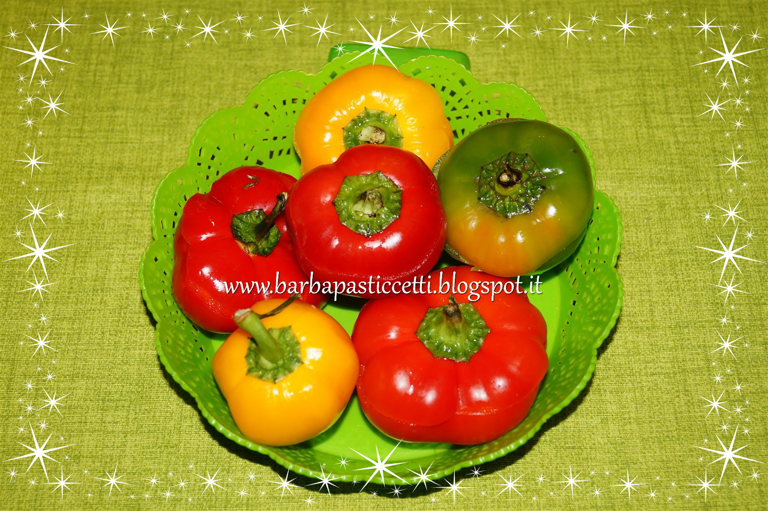 Questi coloratissimi ed invitanti peperoni napoletani, li ho visti la prima volta girovagando tra i banconi di un mercato e me ne sono innamorata.