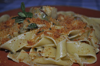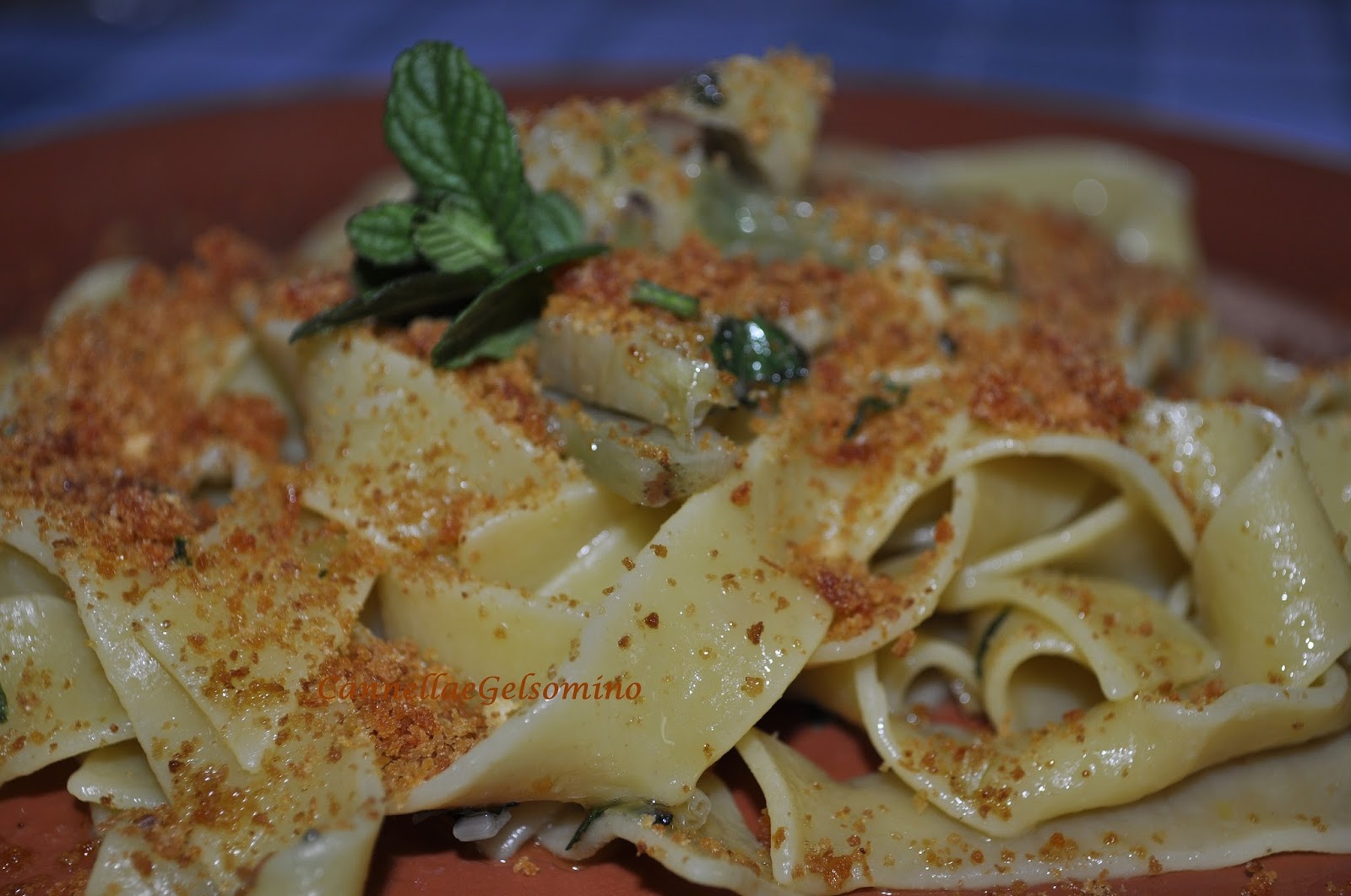 Ingredienti: 320 g di pappardelle, 100 g di pangrattato, 1 cucchiaino di concentrato di pomodoro, 2 cuori di carciofo, peperoncino, menta, prezzemolo, aglio, olio extravergine d’oliva, succo di limone.