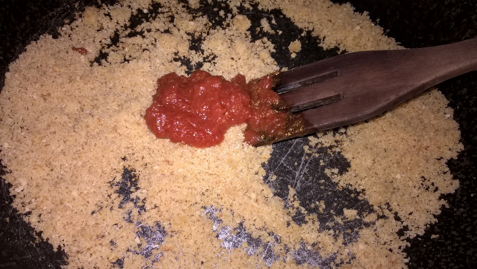 Facciamo tostare il pangrattato (di pane a pasta dura di grani siciliani e lievito madre) con dell’olio extravergine d’oliva. Quando lo vedremo imbiondire aggiungeremo un cucchiaino di salsa di pomodoro molto ristretta oppure di concentato.