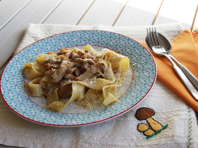 In abbondante acqua salata, lessate le pappardelle, scolatele al dente e saltatele nella padella con il i funghi porcini e la zucca. Fate riposare la pasta due minuti e impiattate guarnendo con il pepe macinato al momento e il pecorino.
