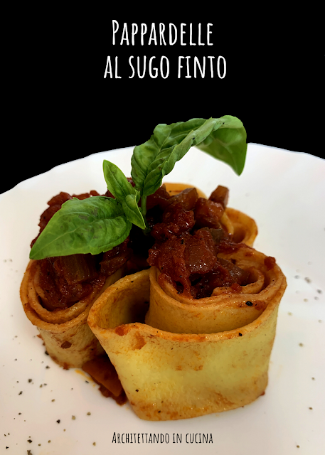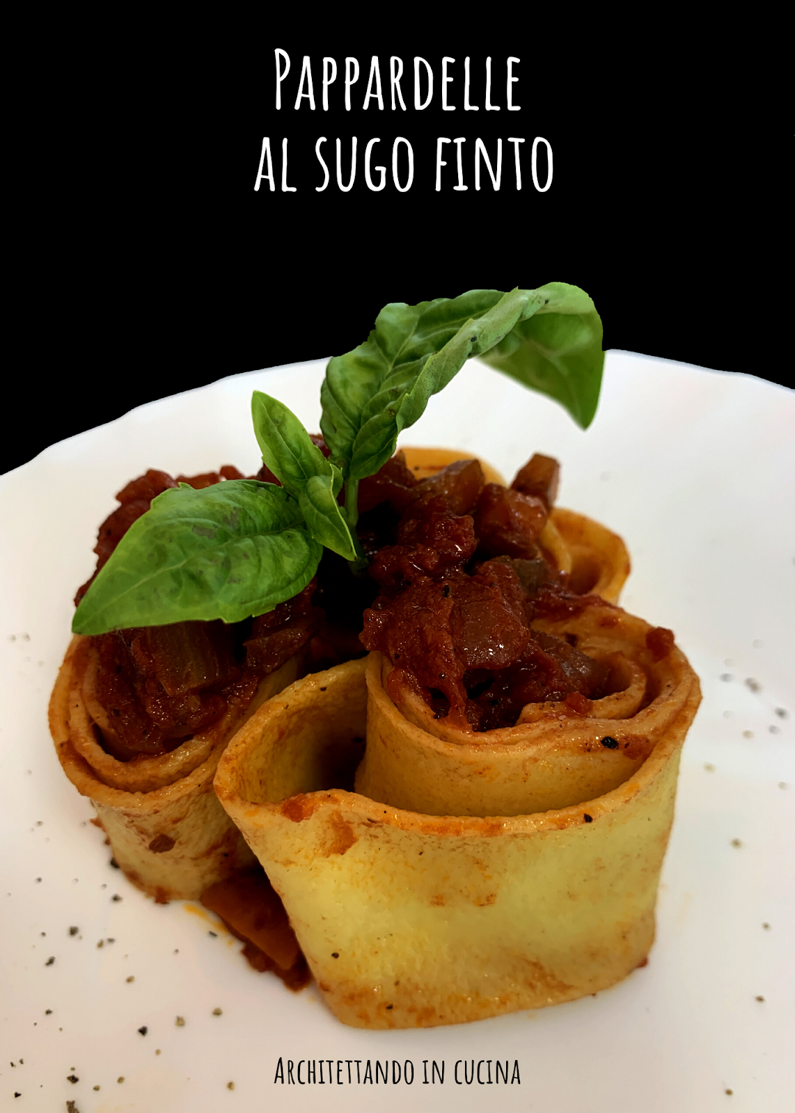 La cucina toscana, è una cucina povera che viene dal mondo contadino, infatti è una cucina fatta di poca carne e molti cereali e verdure. Spesso i piatti sono frutto dell’arte di arrangiarsi e della genialità delle massaie che dovevano cucinare per molte persone con poche materie prime. Di questa caratteristica, le pappardelle al sugo finto, sono le regine. Un piatto gustosissimo che specialmente in estate, quando i pomodori e le verdure dell’orto sono al meglio, dona un gusto incredibile alla pasta, rigorosamente all’uovo e fatta in casa, stesa non troppo sottile e di alto spessore, quello appunto delle pappardelle (2-3 dita diceva mia nonna, altrimenti sono tagliatelle!). Ma cos’è il sugo finto o “ragù scappato”? E’ un ragù senza carne, con molto battuto di verdura e pomodoro, fatto bollire molto, quasi come un ragù di carne. Oggi è la giornata delle pasta al pomodoro per il Calendario del cibo italiano e questo piatto, mi è sembrato adattissimo per festeggiare questa pasta.