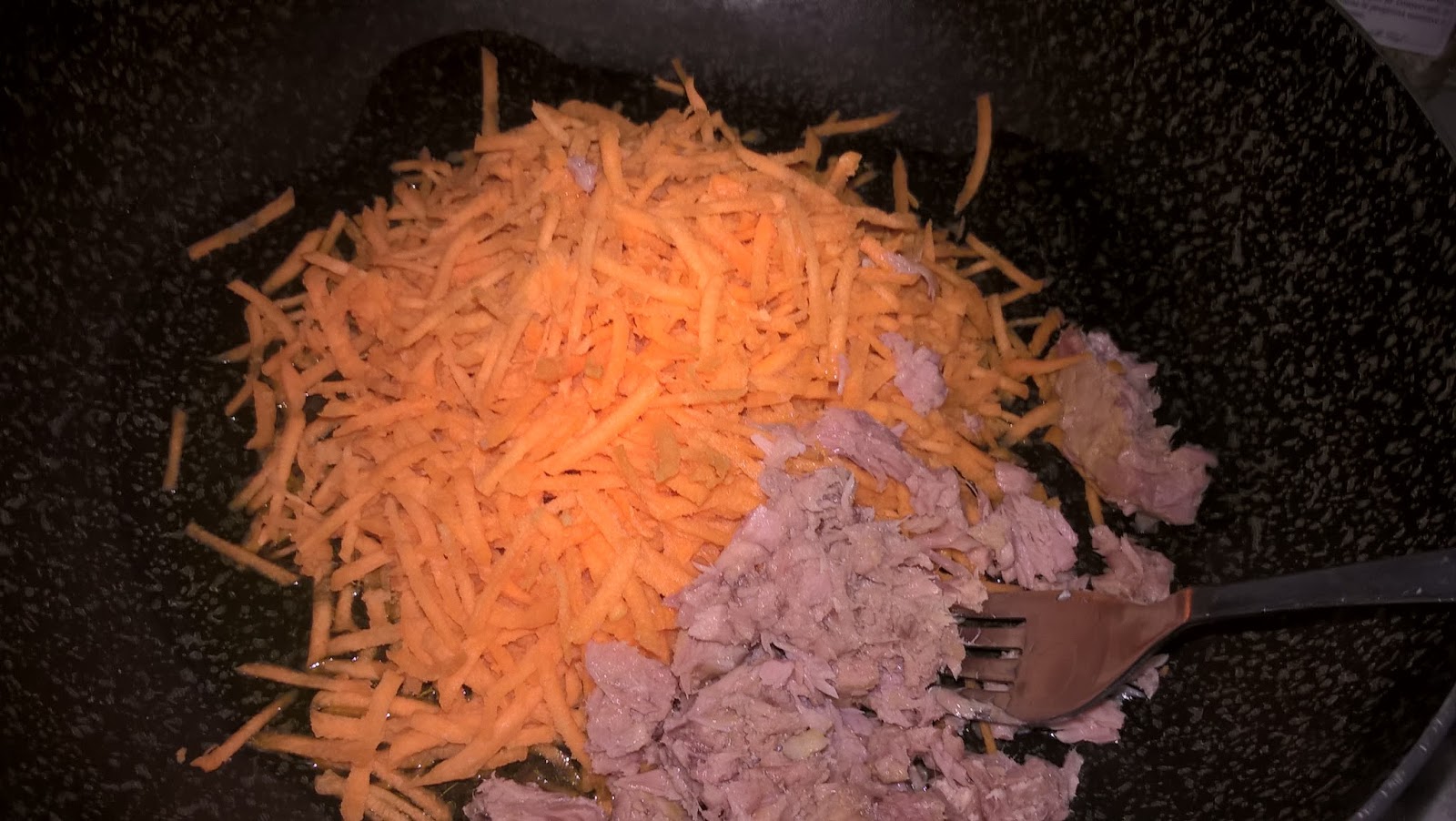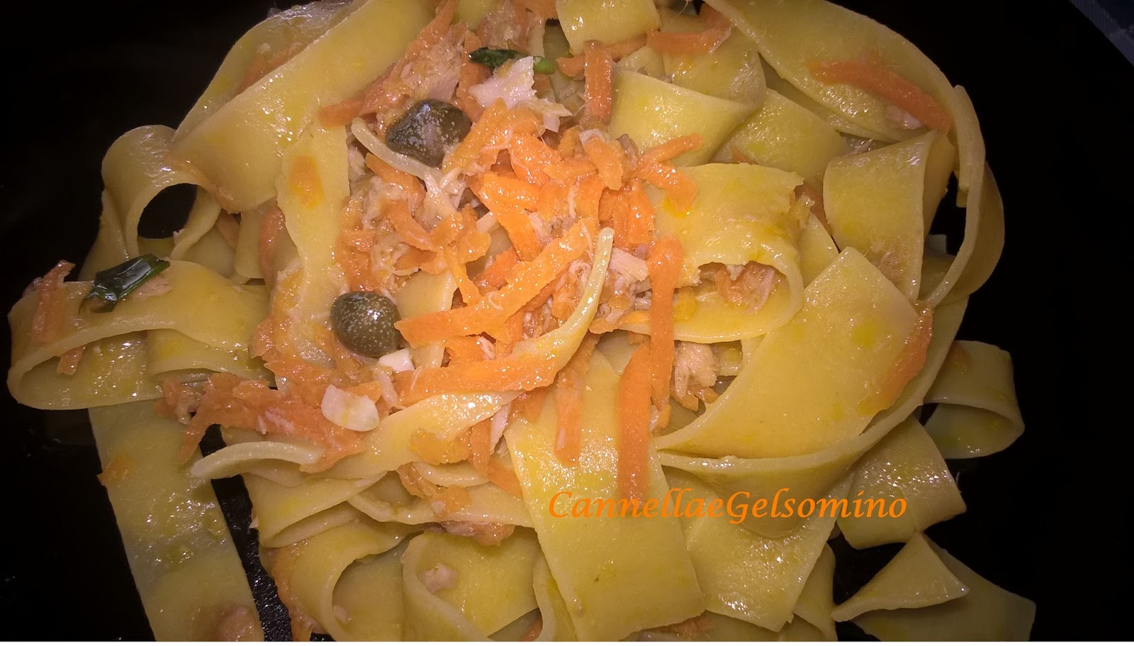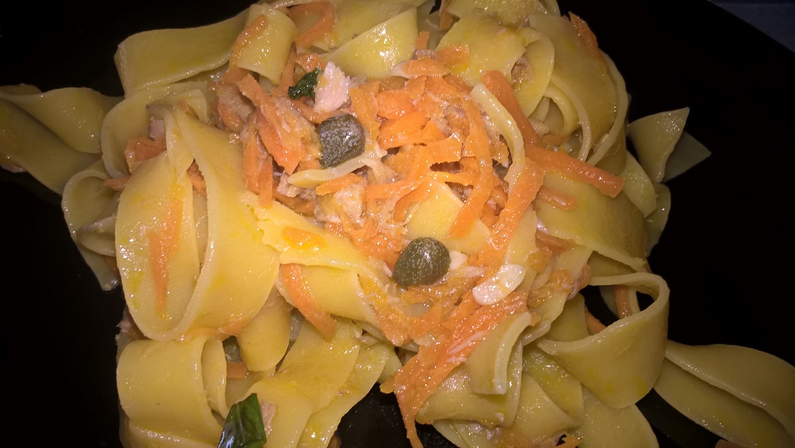 Tagliate le carote a julienne con la grattugia o con il robot; fatele rosolare con olio extravergine d’oliva insieme al tonno sgocciolato (io compro quello al naturale perchè voglio essere sicura dell’olio che mangio). Aggiungere un pizzico di sale, pepe nero e qualche cappero. Lessare la pasta al dente, farla saltare in padella e……. stop.