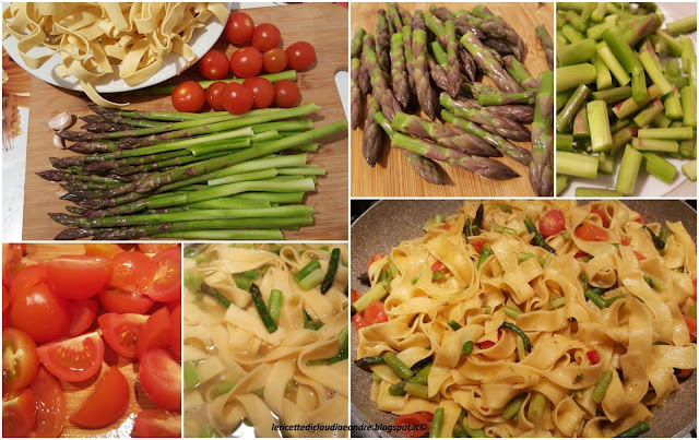 - Scolare la pasta con gli asparagi, aggiungerli nella padella con i pomodorini ed insaporire per 1-2 minuti insaporendo con un pizzico di pepe e una girata di olio extrvaergine.