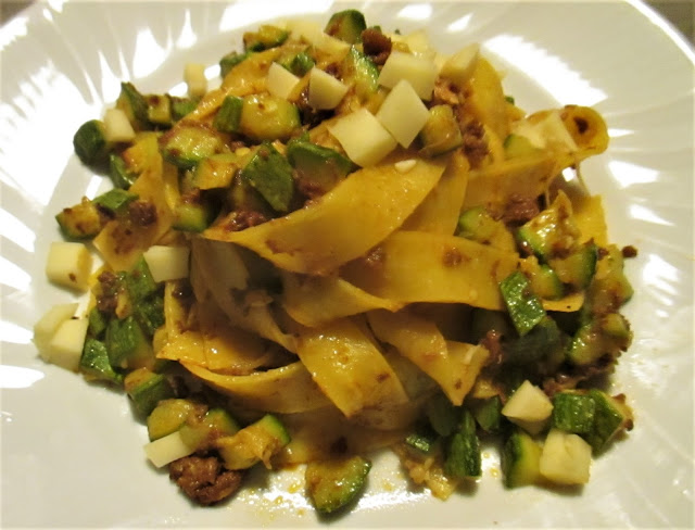 Un primo piatto “di forza” vista la presenza di pappardelle all’uovo, zucchini, scamorza affumicata…,ma soprattutto della gustosissima carne di chianina in ragu. Inutile dire che appena arriva sul piatto finisce immediatamente nello stomaco!!