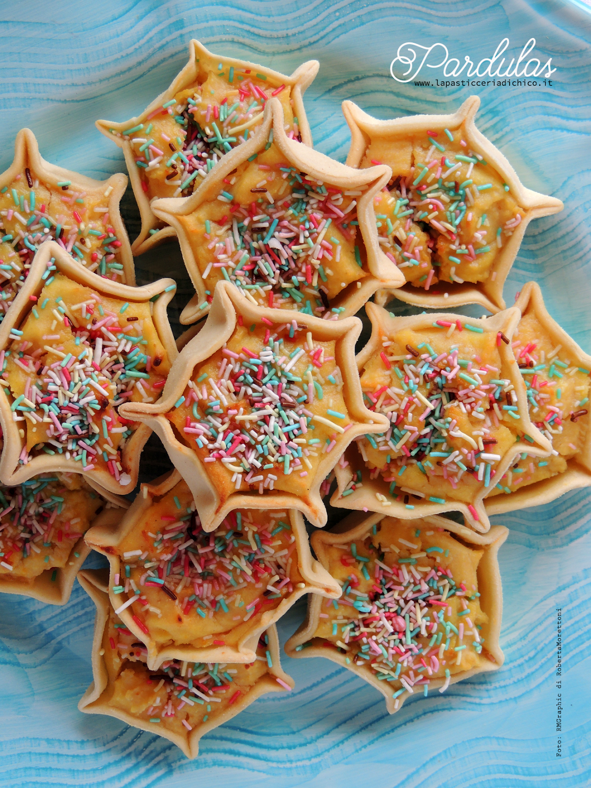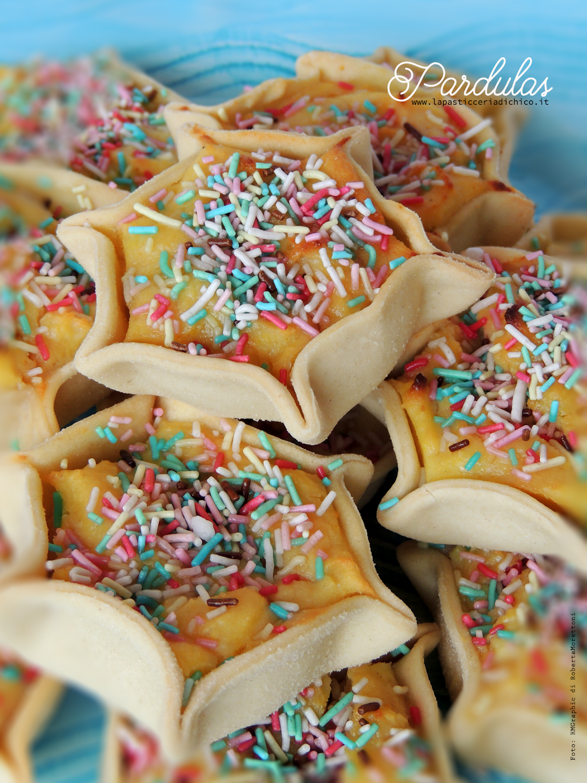 Il suo nome è Pardulas e in realtà non è un dolce, ma sono dei dolcetti con un involucro croccante dalla caratteristica forma a stella, ripieno di un composto a base di ricotta aromatizzata allo zafferano e arancia, decorati con miele e confettini di zucchero colorati.