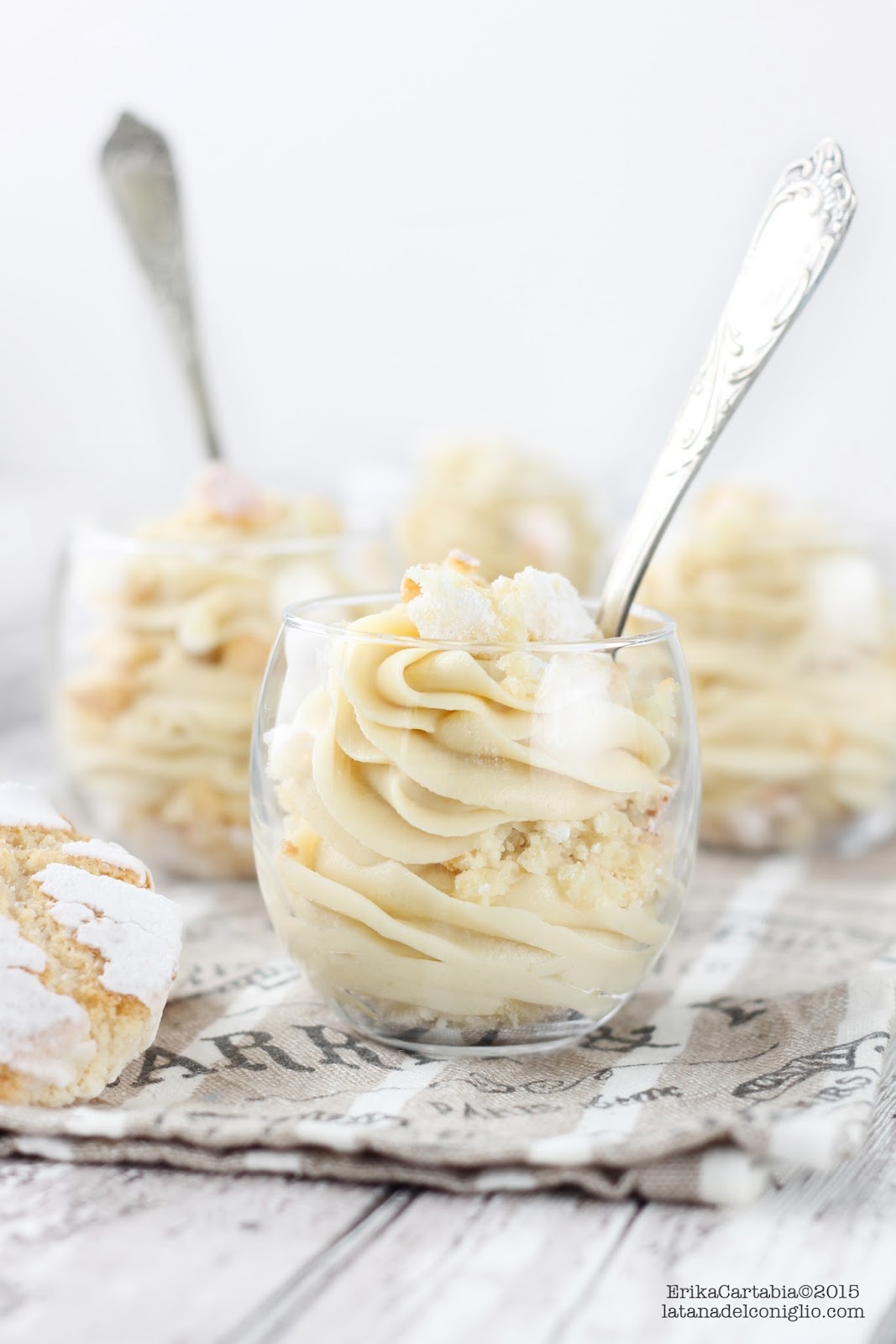 Oggi, un dolce morbido, cremoso, avvolgente, ma soprattutto golosissimo! Questi piccoli parfait al cioccolato bianco e ricciarelli sono stati una sorta di esperimento. Dopo essermi innamorata di quel dolce elegante e voluttuoso quale è il parfait, non ho resistito alla sua versione bianca. Credetemi, è qualcosa di unico, e la croccantezza, unita all’intenso profumo di mandorle dei ricciarelli, vi farà amare queste coppette ancora di più!