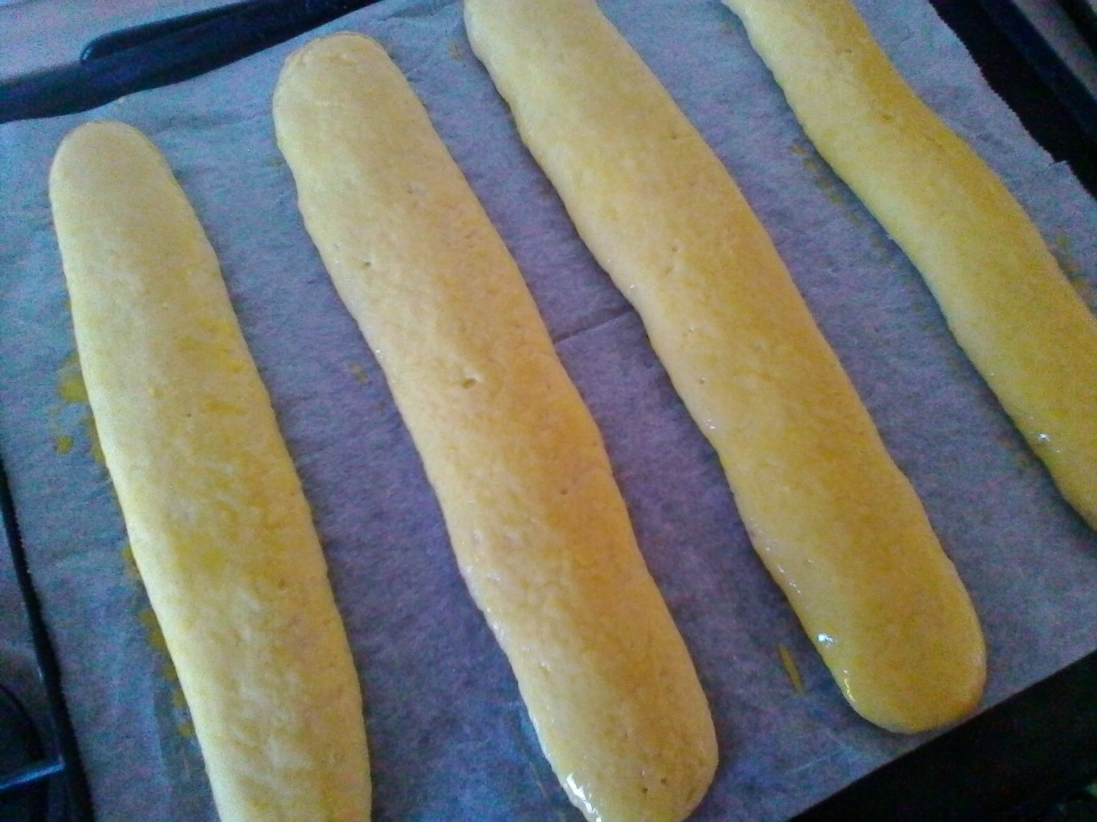 Sbattete il tuorlo rimasto con un pò di latte e spalmatelo sui filoncini. Infornate nel forno già caldo a 180° per 20 minuti, si debbono dorare in superficie.