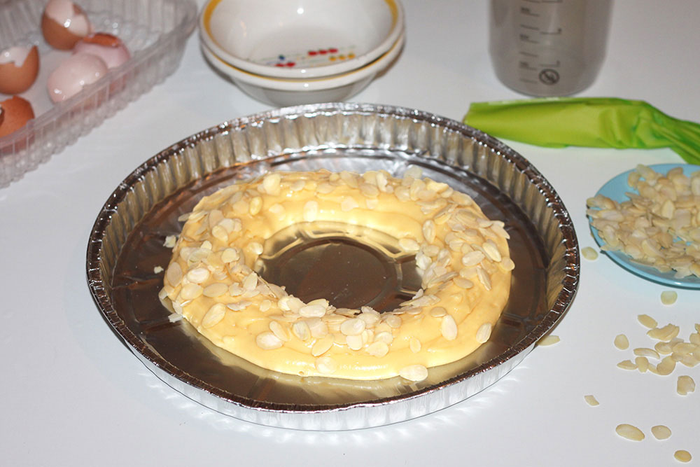 Sbattete l’ultimo uovo e spennellate la pasta bigné. Spolverate la superficie con le lamelle di mandorle. A noi è avanzata un po’ di pasta e abbiamo fatto una mini-ruota (la quantità non è mai perfetta: dipende da quando grandi si fanno gli anelli….).