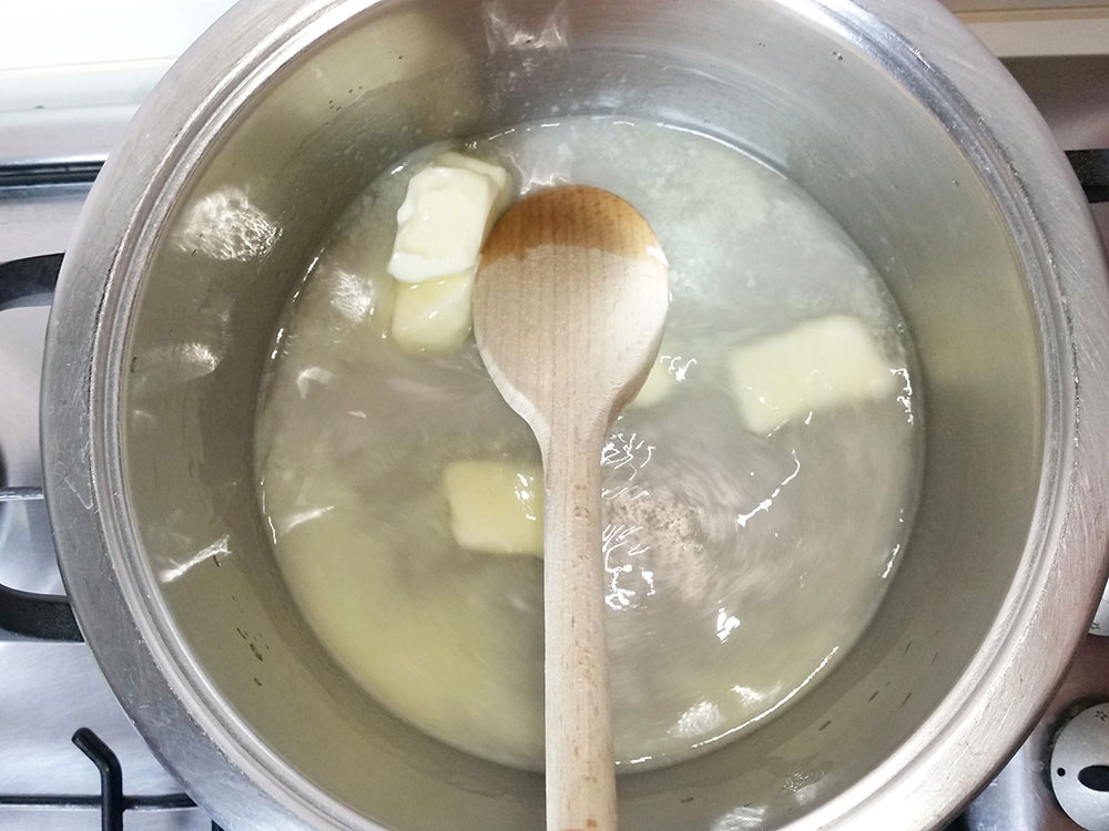 Italiano. Nel frattempo si prepara la pasta choux. Mettere l’acqua col pizzico di sale e il burro in una pentola piuttosto larga, con i bordi alti. Far scaldare in modo che il burro si sciolga bene. Quando l’acqua inizia a bollire, versare la farina in un solo colpo. Girare con un cucchiaio di legno.