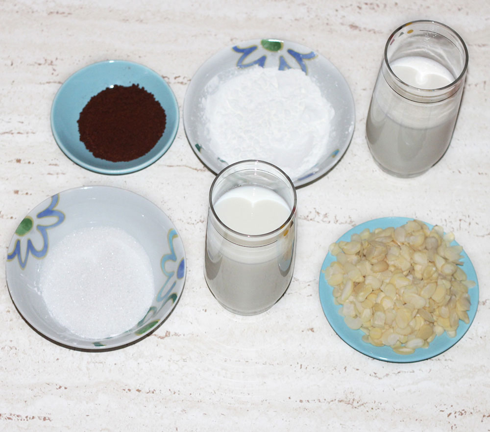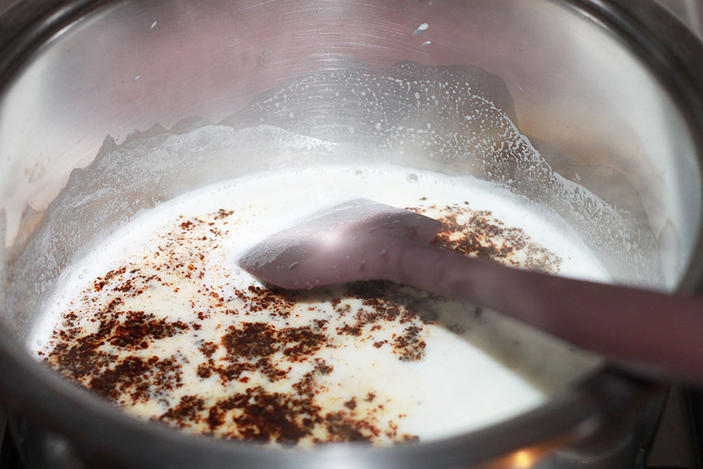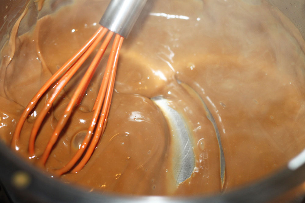 In un pentolino mettere a scaldare il latte con lo zucchero. Quando è caldo, aggiungere il caffè e poi l’amido sciolto. Mescolare.