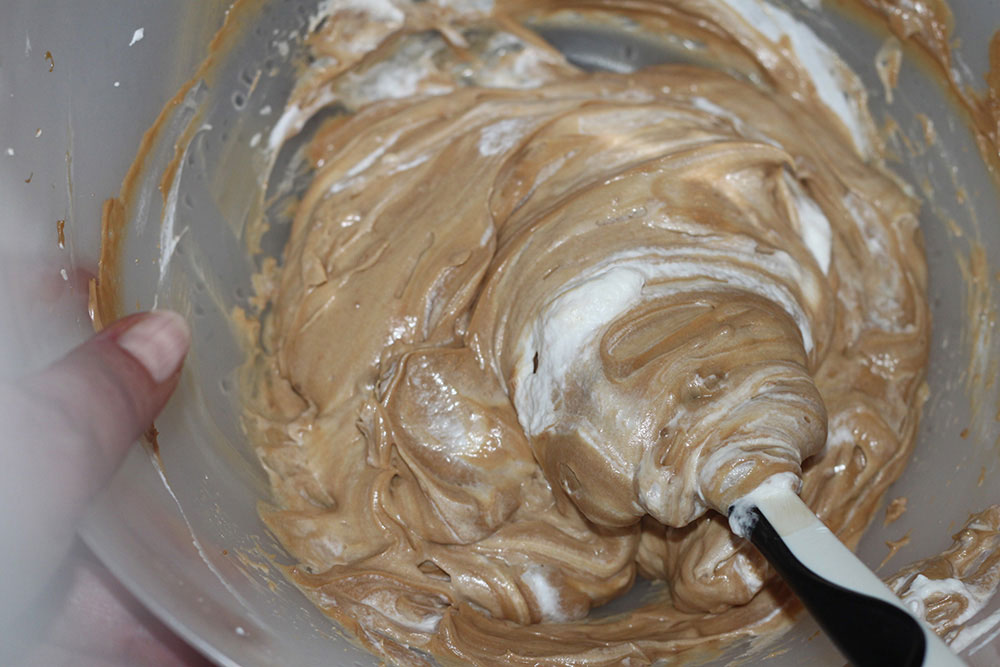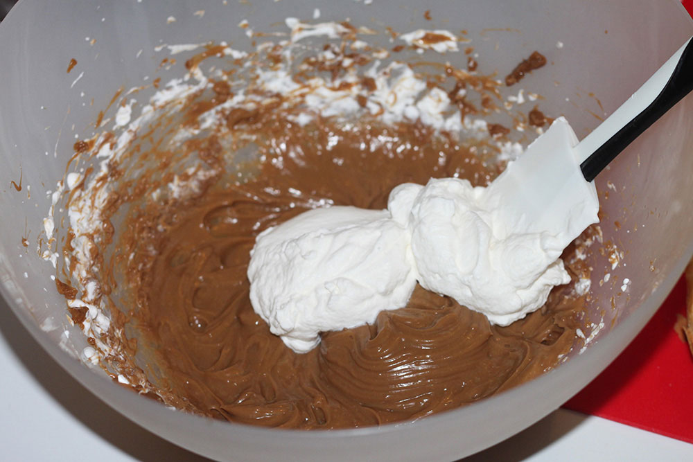 English. Whip up the fresh cream. Then whisk the chilled coffee cream with the electric hand-mixer. Add the whipped cream to the coffee cream a spoon at a time, slowly, until well combined.