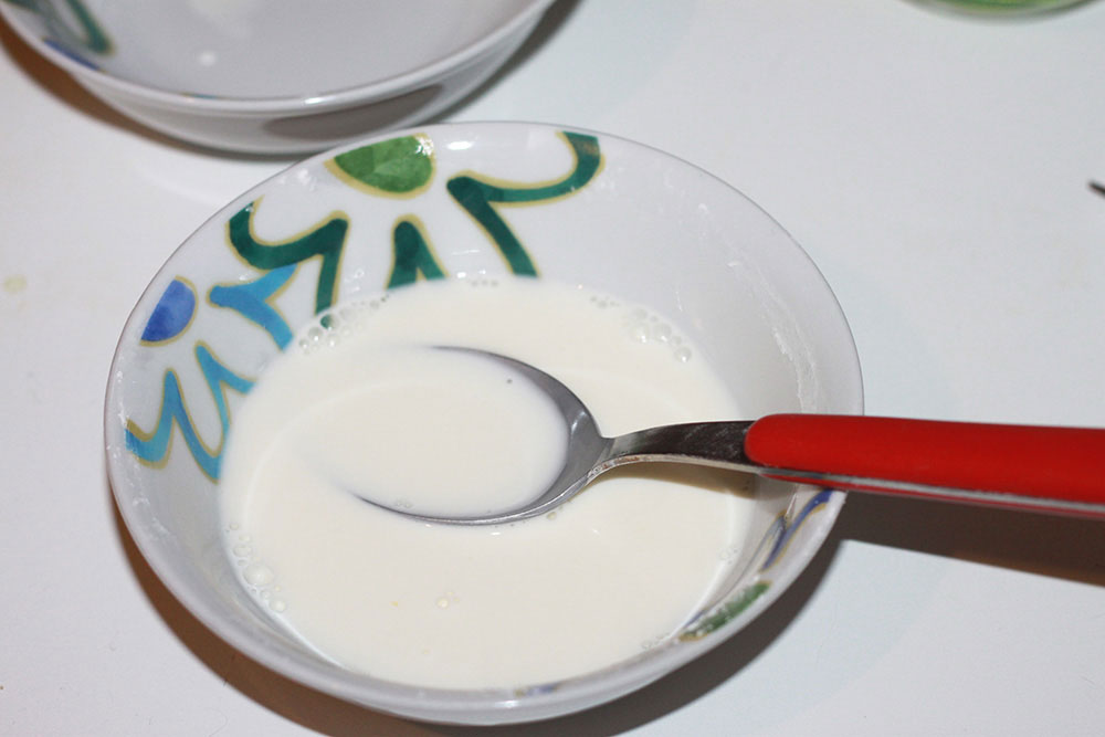 English. First of all let’s make the filling. Place the corn starch in a little bowl; melt the corn starch with a bit of milk until all the lumps disappear.