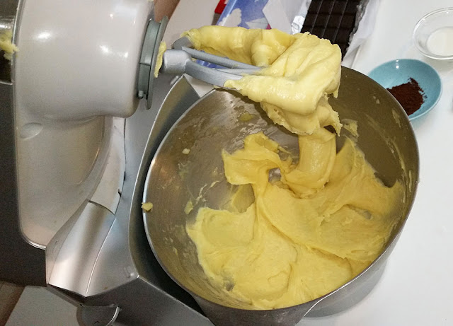 English. Place the choux mixture into the stand mixer-bowl (if you have one) or a simple clean bowl if you are going to work with a hand-mixer. Mix the pastry with the flat beater at low speed until you will see no more smoke rising up from the pate-a-choux.