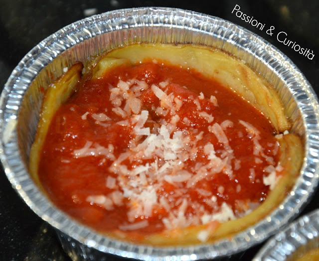 Iniziare mettendo il sugo sul fondo, cospargere di parmigiano grattugiato e appoggiare il primo strato di melanzana, poi fare il bordo facendo girare una o due fettine di melanzana, e continuare sovrapponendo tutti gli strati interni.