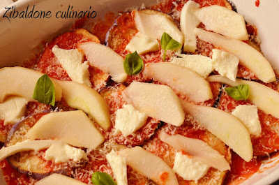 Assemblare la parmigiana: sul fondo mettere un paio di cucchiai di sugo al pomodoro, proseguire con le melanzane, in modo che coprano tutta la superficie della pirofila, salare, mettere altro sugo, poi parmigiano reggiano grattugiato, qualche pezzetto di mozzarella e le fette sottili di pera. aromatizzare con qualche fogliolina di basilico e riprendere con le melanzane, il sugo, il parmigiano, la mozzarella, le pere, fino a completare lo stampo.