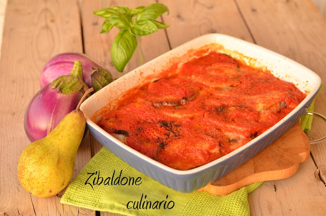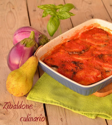 La ricetta l’ho interpretata tal quale, cambiando solo la presentazione (ho fatto una teglia unica), e invece dei pelati ho usato i miei pomodori San Marzano dell’orto appena cotti e frullati con il bimby.