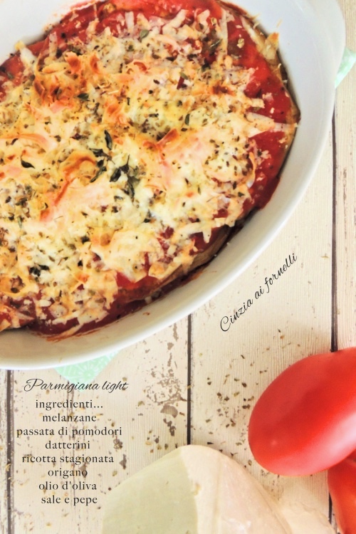 - Sfornare e comporre la parmigiana light, iniziando a disporre qualche fetta in una pirofila, cospargere un poca di passata di pomodoro, grattugiare un poca di ricotta stagionata e ricominciare con le melanzane, fino ad esaurimento degli ingredienti, terminando con passata di pomodoro e ricotta grattugiata. Cospargere ancora un poco di origano, pepe a piacere e infornare.