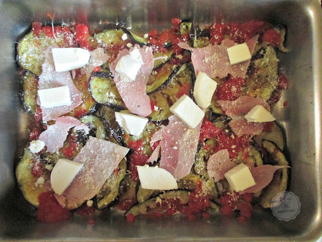 Ripetiamo: sugo, melanzane, prosciutto, mozzarelle e parmigiano.
