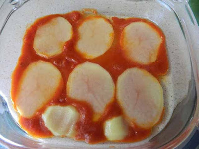 Cospargere il fondo di una pirofila da forno con della passata di pomodoro quindi fare un primo strato con le patate,