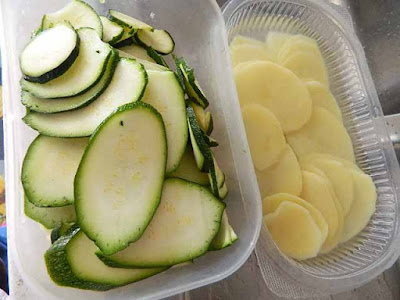Lavare, spuntare le estremità della zucchina e affettarla, sbucciare la patata e affettarla