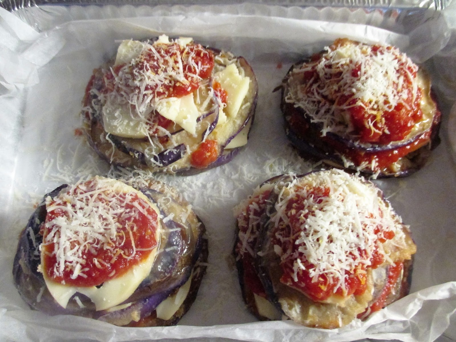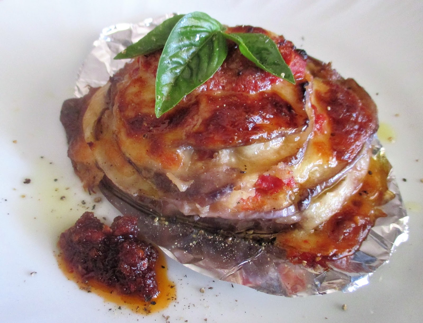 In a baking dish, place on top of the parchment paper. Compose domes parmigiana putting first a slice of eggplant, then a smoked cheese, a tablespoon of tomato sauce and a dried tomato sauce. Complete scratching the top with pecorino cheese.