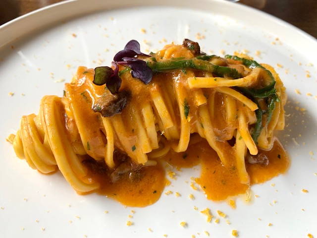 primo: chitarra abruzzese, aglio, olio e peperoncino, ricci di mare, salicornia, bottarga e limone