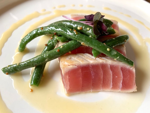 secondo: tataki di tonno, fagiolini, senape in grani e salsa all’arancia
