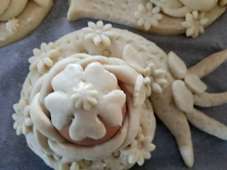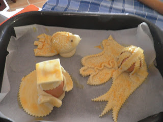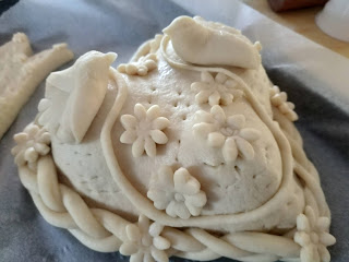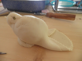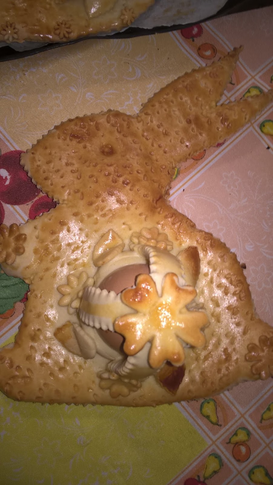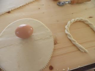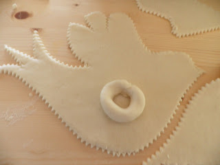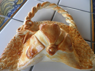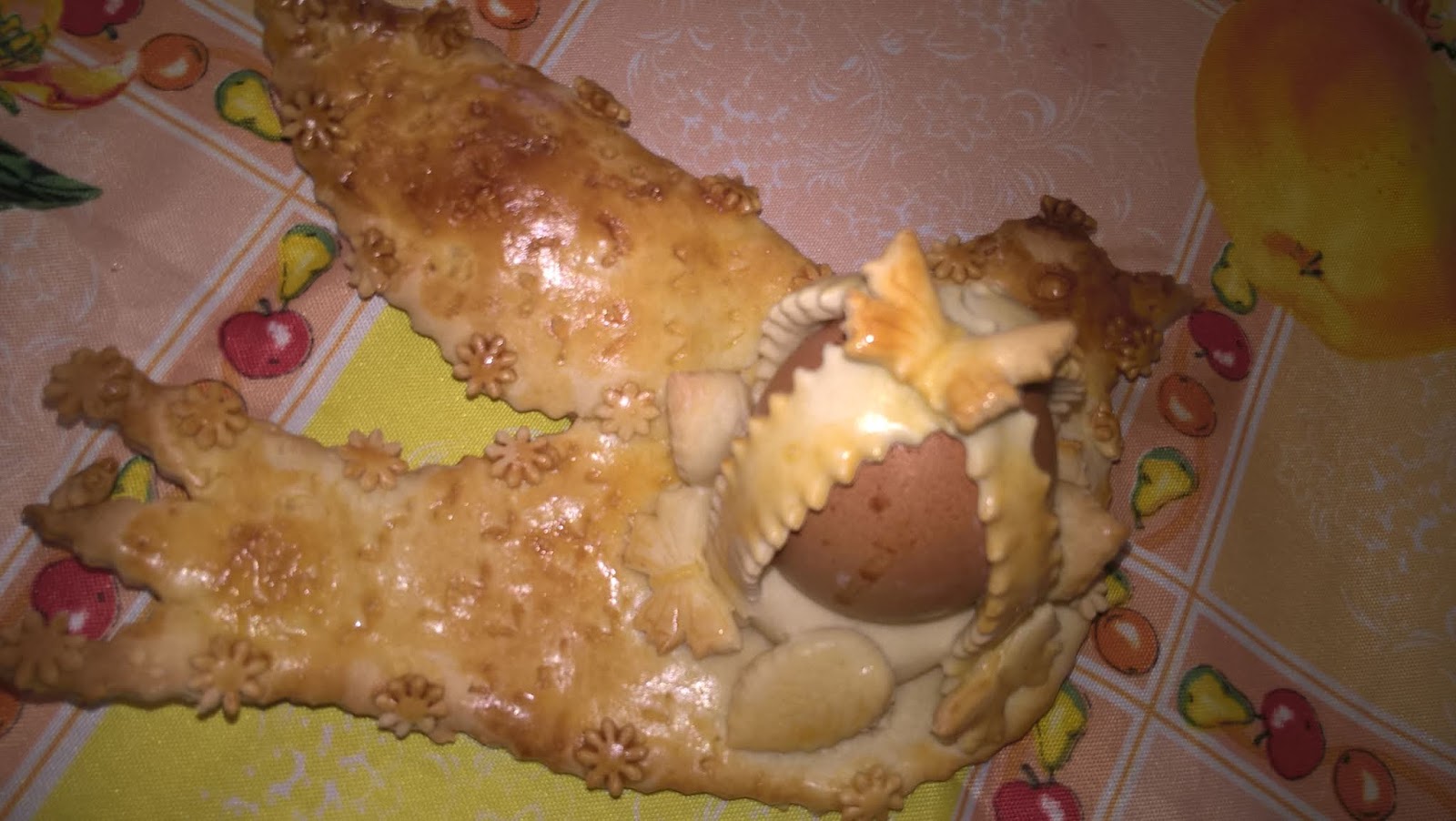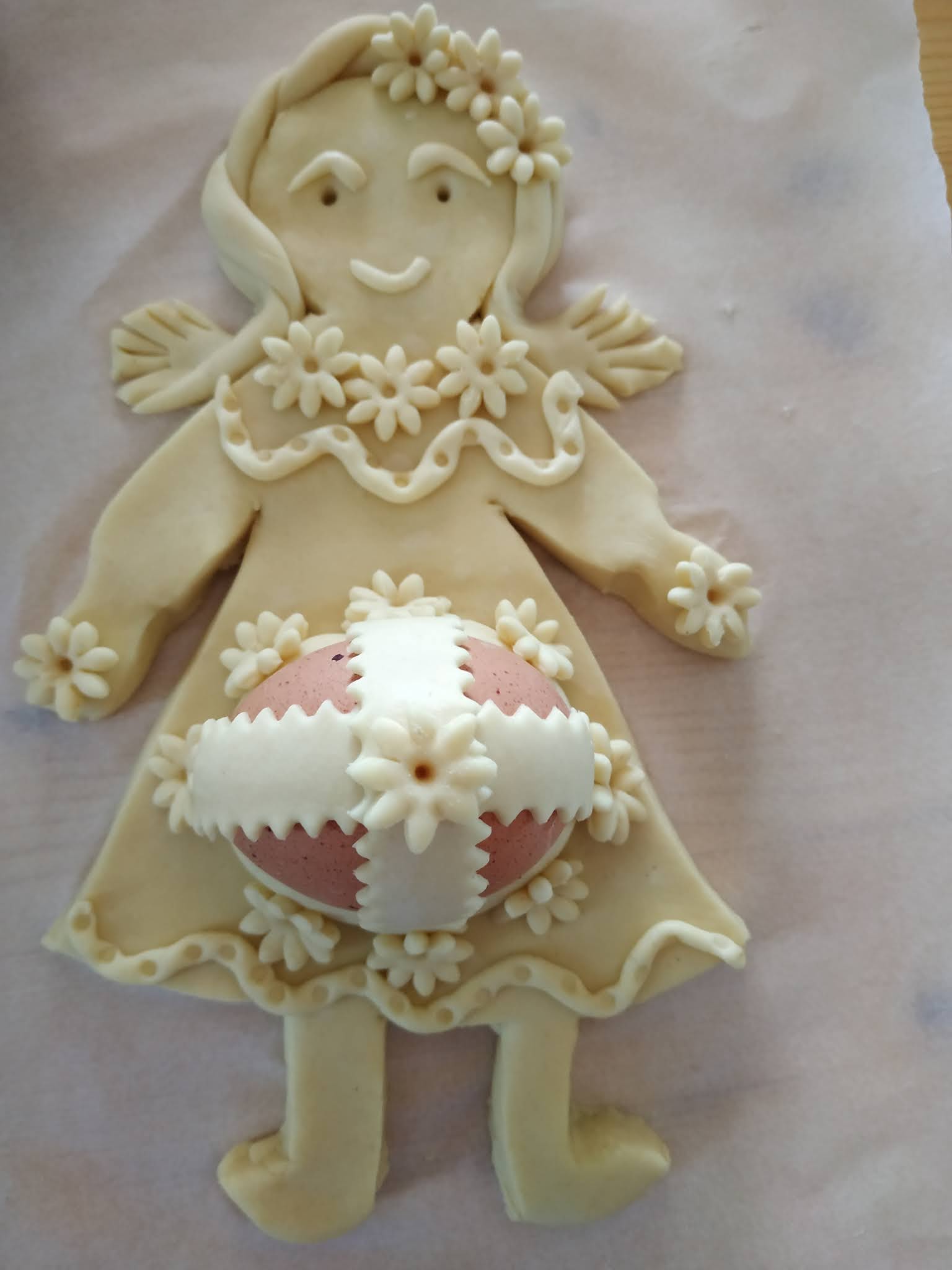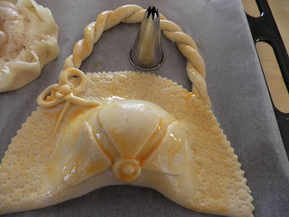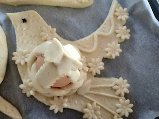 Stendere la pasta in una sfoglia di mezzo centimetro circa, ritagliare la sagoma di una colomba o del soggetto che vi piace rappresentare, sistemarvi l’uovo crudo al centro e fissarlo con strisce di pasta; spennellare con uovo sbattuto; per gli occhietti si possono usare chiodi di garofano o grani di pepe o quello che riuscite a reperire. Per le decorazioni usate delle forbicine o qualsiasi oggetto la vostra fantasia vi suggerisca: io per la borsetta ho usato una bocchetta del sac à poche. Infornare a 200° e far cuocere per mezz’ora.