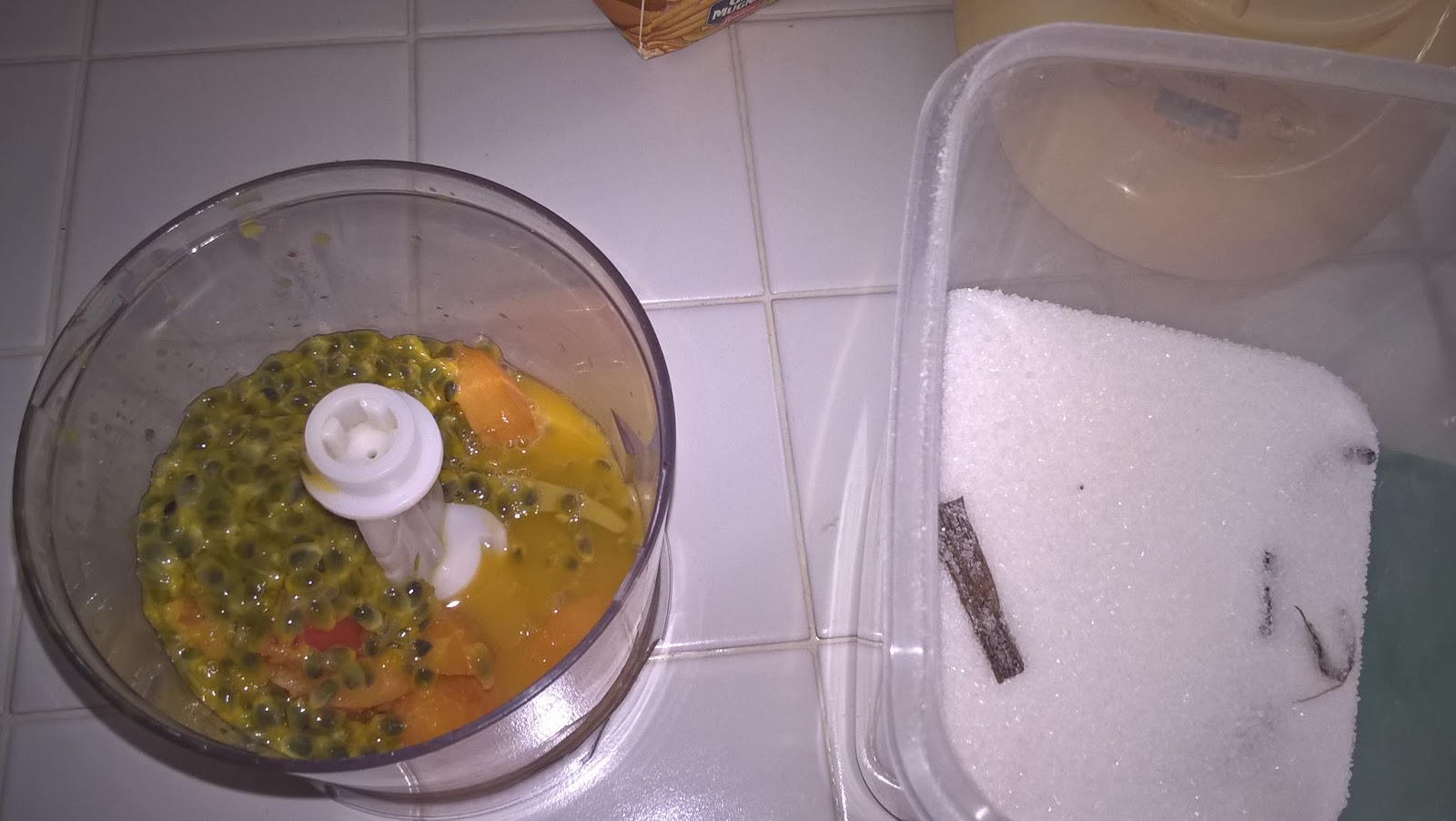 Ho messo la polpa in un mixer e ho dolcificato con zucchero alla vaniglia, giusto quel po’ per correggere l’acidità della frutta (andate a gusto personale).