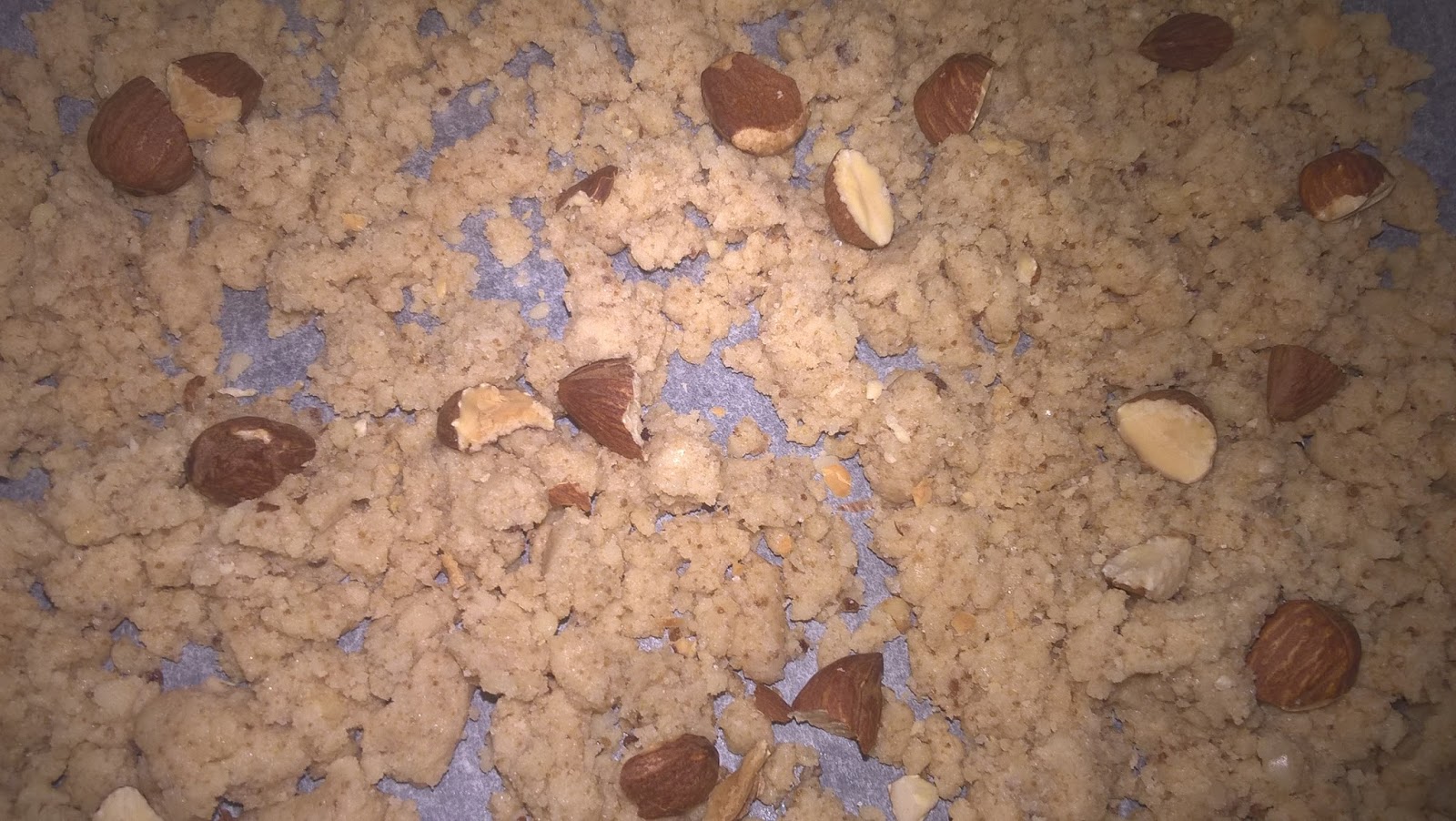 Sistemo su una placca da forno rivestita di carta; aggiungo qualche mandorla intera o spezzettata e inforno a 180° fino a quando sarà di colore ambrato.