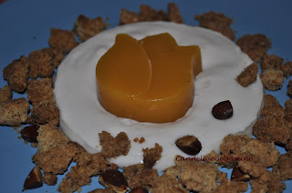 Per montare il dolce: se lo preferite al piatto, fate una base di crema alle mandorle, sbriciolate il crumble attorno e sistemate la gelatina di frutta al centro; se vi piace montarlo in un bicchiere invece, fate uno strato di crumble, la crema, infine le gelatine (che chiaramente saranno più piccole) e qualche altra briciola di crumble.
