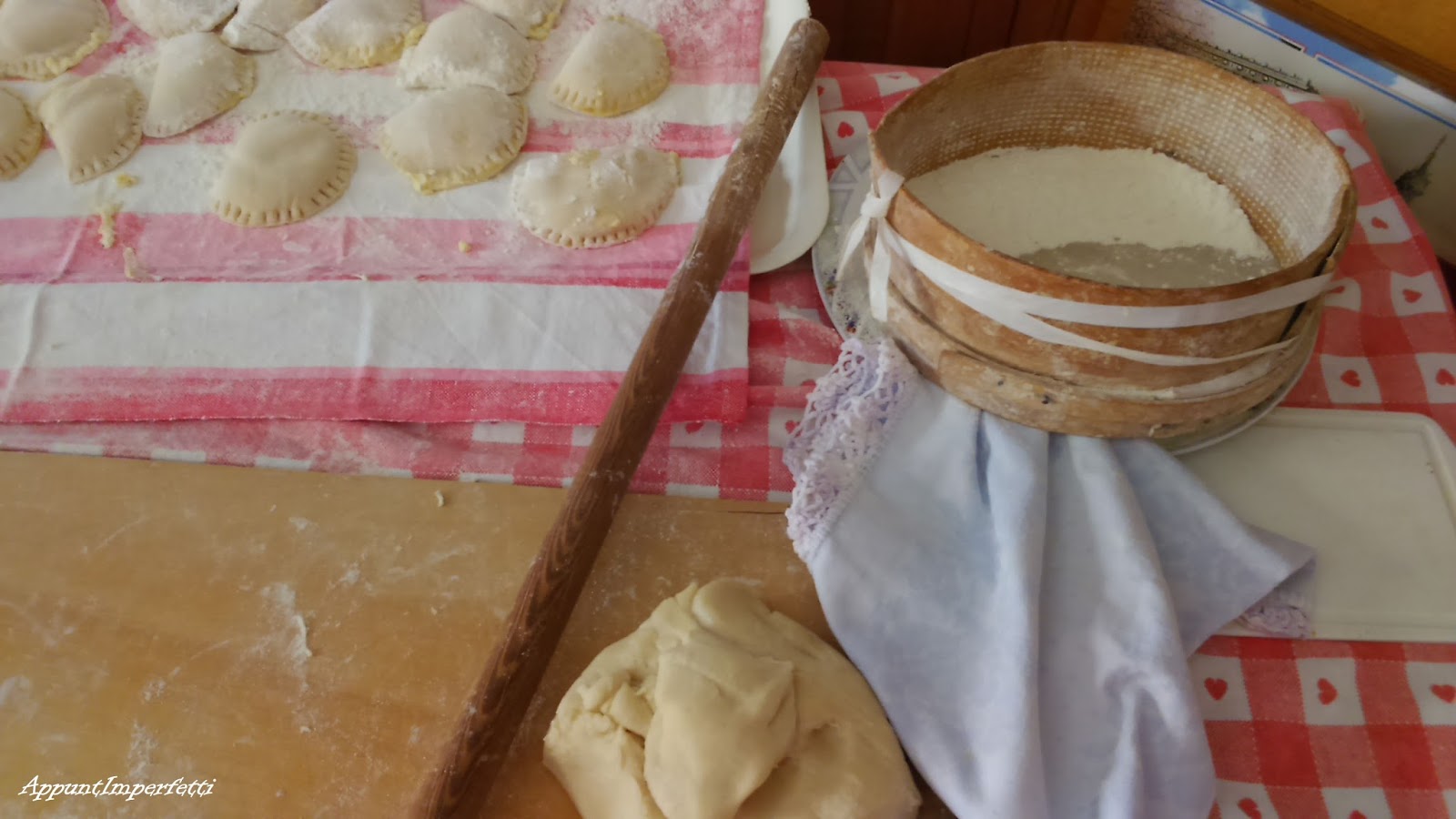 A casa della nonna un piatto tipico della domenica è la pasta acqua e farina rigorosamente preparata a mano … la farina viene setacciata, impastata su una spianatoia di legno e tirata col mattarello.L’impasto è versatile e se ne possono ricavare diversi formati, in versione corta i cavatelli o cicatielli come li chiama la nonna, pasta lunga come i pici o in versione ripiena come ravioli ripieni di ricotta.