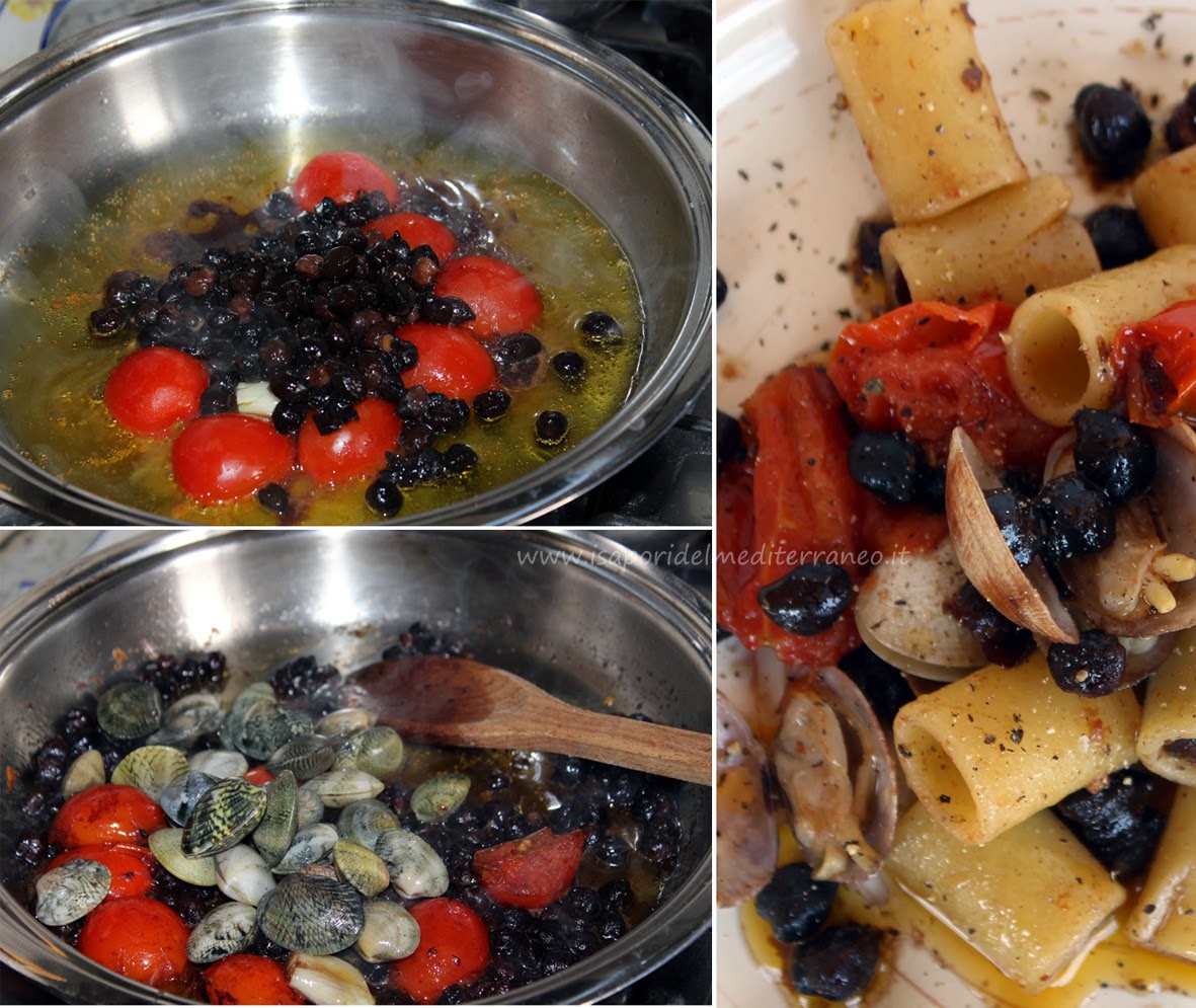 In una padella ho messo l’olio extra vergine di oliva e lo spicchio d’aglio schiacciato.La procedura di soffritto e’ durata per circa 15 minuti , più lenta e’ questa operazione maggiore sarà l’aroma che l’aglio rilascia nell’olio extra vergine di oliva. L’aglio non deve dorare ma deve cuocersi lentamente, quindi ho messo la padella sul fornello del caffè a fuoco lentissimo.Trascorso il tempo ho adagiato i pomodorini e ho versato i ceci neri di Pomarico. Ho messo la pentola su un fornello normale a fiamma lento-media e ho fatto insaporire il tutto per 7-8 minuti.A questo punto ho versato le vongole veraci, ho coperto la pentola con un coperchio, il tempo che le stesse si aprissero.Ho tolto il fuoco e ho messo il sughetto dei ceci neri di Pomarico e vongole veraci da parte.
