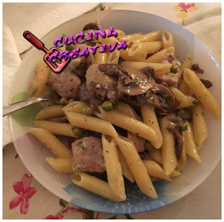 200 gr di mezze penne 2 misurini e 3/4 d’acqua 20 gr di olio evo 1 spicchio d’aglio tritato peperoncino q.b. 1 salsiccia piccola 70 gr di misto funghi o porcini surgelati 80 gr di pisellini surgelati 40 gr d’acqua 100 gr di panna da cucina prezzemolo q.b. Mettere nel cook l’aglio, l’olio, il peperoncino, i funghi, i pisellini e la salsiccia a pezzi impostare la funzione frittura vegetali per 12 minuti, dopo 5 minuti aggiungere 40 gr d’acqua, mescolare ogni tanto fino al termine del programma. A questo punto mettere la pasta, l’acqua e il sale e impostare la funzione bollire per 11 minuti un minuto prima della fine del programma aggiungere il prezzemolo e la panna mescolare bene, attendere il suono e servire.