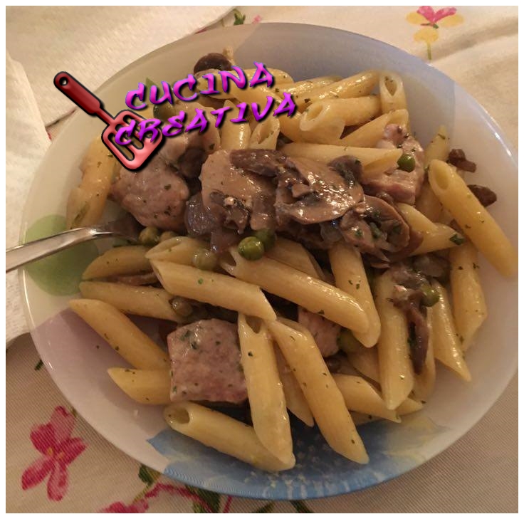 200 gr di mezze penne 2 misurini e 3/4 d’acqua 20 gr di olio evo 1 spicchio d’aglio tritato peperoncino q.b. 1 salsiccia piccola 70 gr di misto funghi o porcini surgelati 80 gr di pisellini surgelati 40 gr d’acqua 100 gr di panna da cucina prezzemolo q.b. Mettere nel cook l’aglio, l’olio, il peperoncino, i funghi, i pisellini e la salsiccia a pezzi impostare la funzione frittura vegetali per 12 minuti, dopo 5 minuti aggiungere 40 gr d’acqua, mescolare ogni tanto fino al termine del programma. A questo punto mettere la pasta, l’acqua e il sale e impostare la funzione bollire per 11 minuti un minuto prima della fine del programma aggiungere il prezzemolo e la panna mescolare bene, attendere il suono e servire.