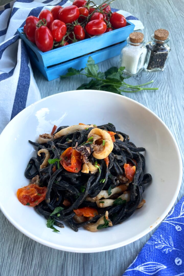 Nel frattempo cuocete la pasta nell’acqua bollente: basteranno 3 minuti. Scolate la pasta e tuffatela nel sugo, mantecatela per un minuto e servite la pasta al nero di seppia bella calda.