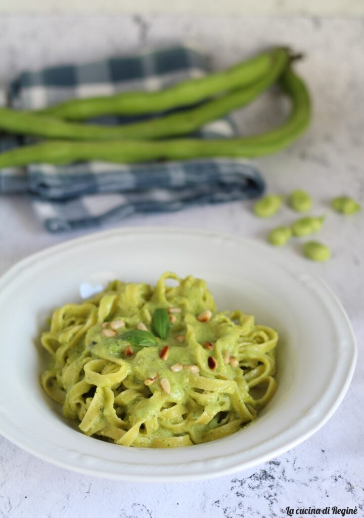 Per prepararla, innanzitutto, le fave vengono scottate per un paio di minuti in acqua bollente. In questo modo, sarà molto più facile eliminare la pellicina esterna e ottenere una crema liscia e dal colore verde brillante. Successivamente, si frullano insieme agli ingredienti classici del pesto, come pinoli, parmigiano, basilico e olio extravergine d’oliva. Il risultato è un condimento ricco, profumato e super cremoso, ideale per avvolgere alla perfezione le tagliatelle.