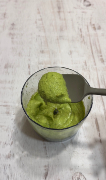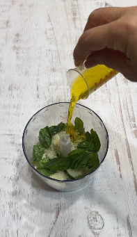 Aggiungi il formaggio grattugiato, i pinoli, un pizzico di sale, le foglie di basilico e l’olio extravergine d’oliva. Frulla tutto fino a ottenere una crema liscia, brillante e super avvolgente. Se necessario, aggiungi un filo d’olio in più per regolare la consistenza.