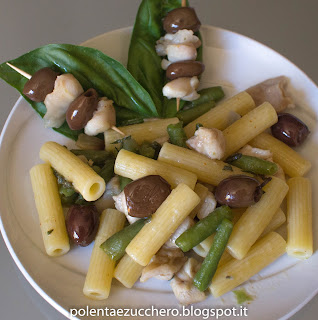 Tritare finemente lo scalogno con le foglie di salvia e rosolarlo in un saltapasta con alcuni cucchiai di olio d’oliva, aggiungere i cubetti di polpa di coniglio e rosolarli velocemente per qualche secondo, sfumare il tutto con mezzo bicchiere di vino bianco e continuare la cottura per 5 minuti. Aggiungere i fagiolini lasciando ancora sul fuoco per 2/3 minuti il sugo, salare, mettere poco peperoncino poi lasciare in attesa. A cottura ultimata scolare la pasta, mettere la padella con il sugo sul fornello ed aggiungere le olive e le foglie di basilico spezzettate con le mani, mescolare bene poi versare la pasta. Saltarla un minuto per amalgamarla al condimento quindi servire.